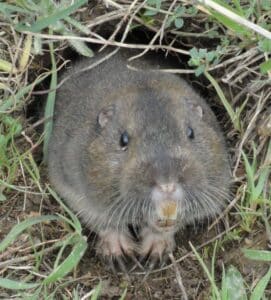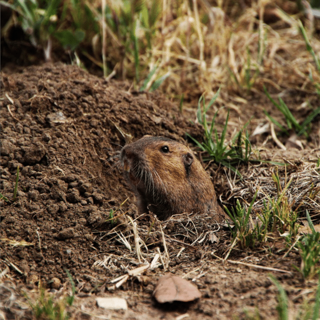 You will sometimes see gophers pop their heads out of their mounds very briefly but it is very uncommon for them to travel above ground. They are large rodents (anywhere from 6-10 inches long in adulthood!) that are brown in color. They are recognizable by their very large exposed front teeth. They also have small ears and large claws that help them dig more efficiently.